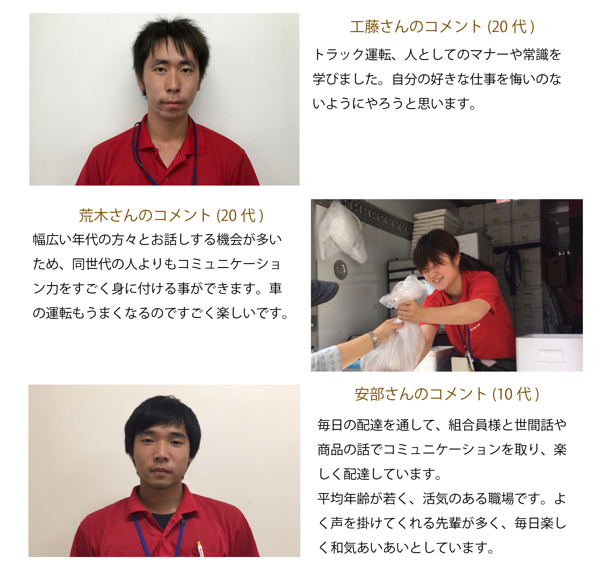 担当エリアのコープおおいた組合員様への商品配達、生協加入の提案、生協商品の案内などを行います。人の役に立ち、喜ばれる仕事がしたい、人と接する仕事をしたい方に向いている仕事です。 また、組合員様とのふれあいが多く、「ありがとう」を沢山いただける仕事です。